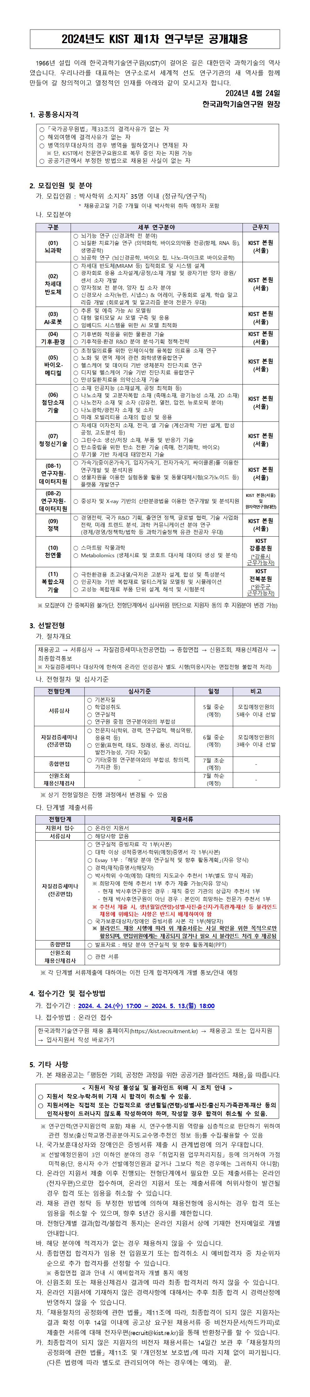2024년도 KIST 제1차 연구부문 공개채용